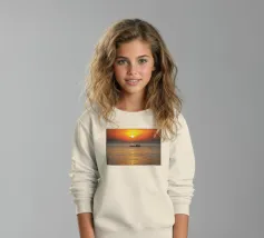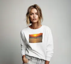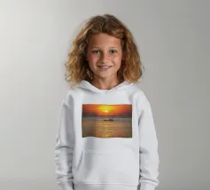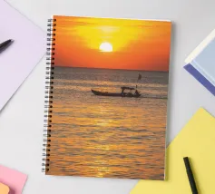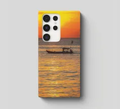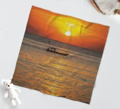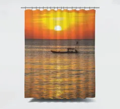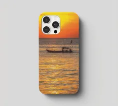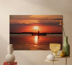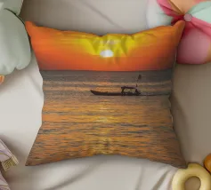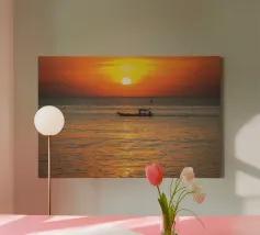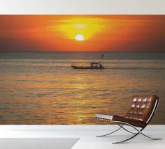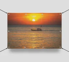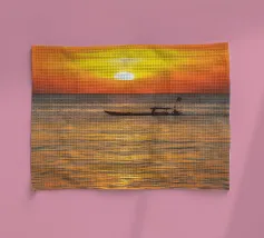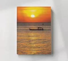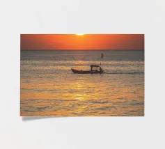 Una piccola barca vietnamita si staglia su un mare calmo al tramonto.