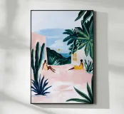 "Sunset Courtyard" ritrae una scena tranquilla di due donne che si rilassano in un cortile aperto, circondato da una vegetazione lussureggiante e affacciato sul mare, mentre il sole inizia a tramontare. I morbidi toni pastello dell'architettura contrastano splendidamente con il verde intenso delle piante, mentre il sole dorato crea un'atmosfera calda e serena. Quest'opera d'arte cattura la tranquilla bellezza di un momento di quiete nella natura, perfetta per chi desidera portare un senso di calma e fascino mediterraneo nel proprio spazio. Progettato da BALIKA HOMES.