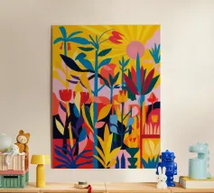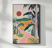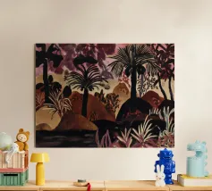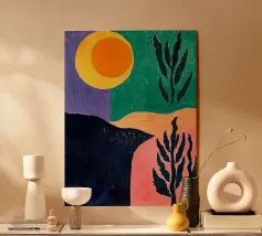 "Sunset Jungle Path" è un vibrante paesaggio astratto che cattura il calore e l'energia di una giungla tropicale al tramonto. Pennellate audaci ed espressive di verdi, rosa e gialli conducono l'osservatore lungo un sentiero tortuoso, mentre il sole al tramonto - un globo rosso incandescente - aggiunge un tocco di misticismo alla scena. L'uso giocoso di colori e forme evoca un senso di avventura e tranquillità, rendendo quest'opera d'arte perfetta per aggiungere un'atmosfera vivace ed esotica a qualsiasi spazio. Progettato da BALIKA HOMES.