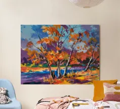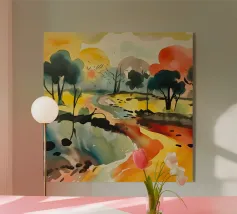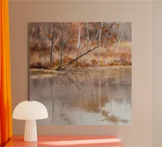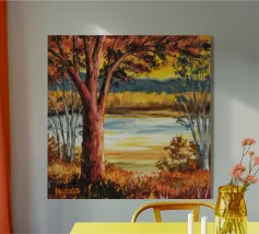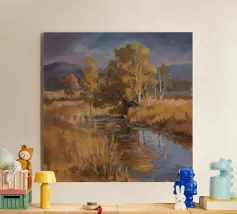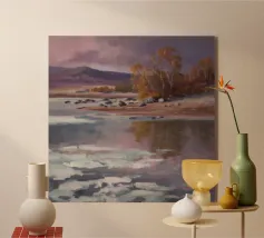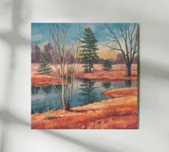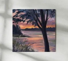 This painting captures a sunset over a marshy landscape, with reflections in the water. The warm hues and tranquil setting evoke a sense of calm and beauty.