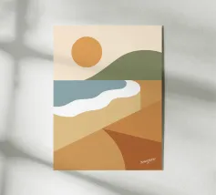 Una composizione audace e minimalista che cattura l'essenza di un tramonto estivo con una geometria stilizzata. La scena, caratterizzata da calde tonalità di pesca e oro e da un morbido gradiente di onde verde acqua, bilancia calore e freschezza con perfetta armonia. Quest'opera d'arte fonde la calma nostalgica delle serate in spiaggia con un'estetica moderna e piatta, ideale per l'arredamento contemporaneo o per le collezioni a tema estivo.