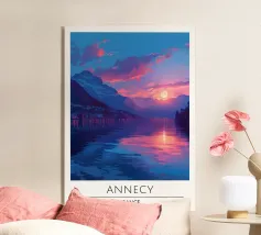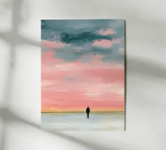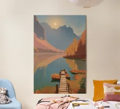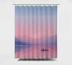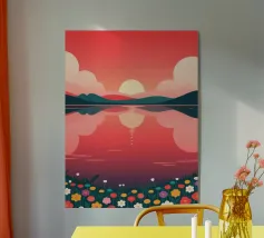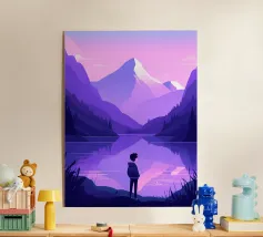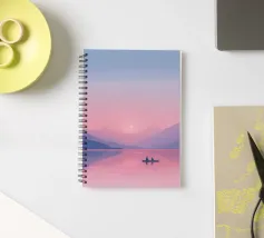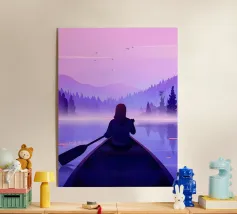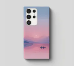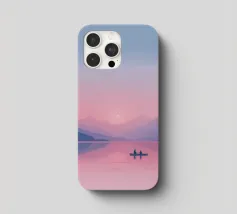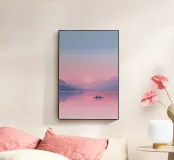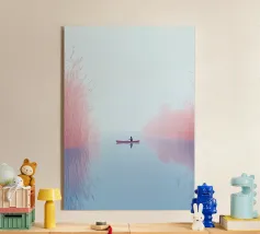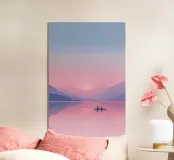 Una dolce barca a remi galleggia su acque specchiate, immersa in sognanti tonalità di rosa e lilla. Le montagne stratificate sfumano in lontananza sotto un sole tranquillo, evocando un senso di connessione tranquilla e di tempo sospeso. Una composizione poetica di quiete, natura e calma emotiva.