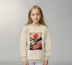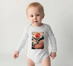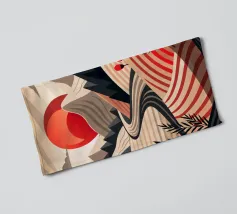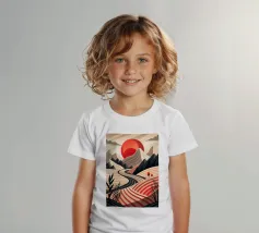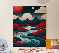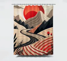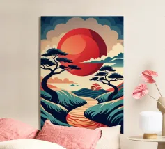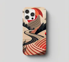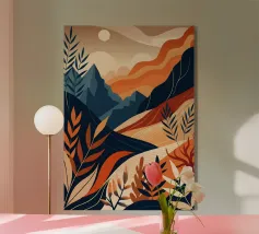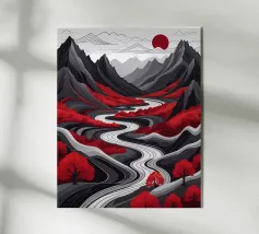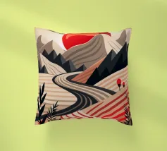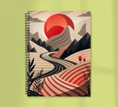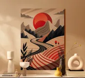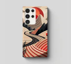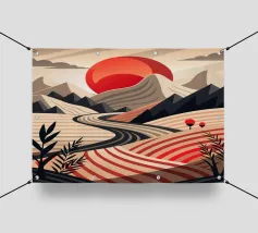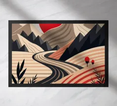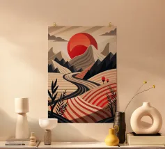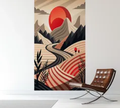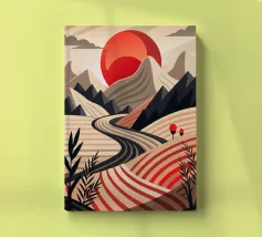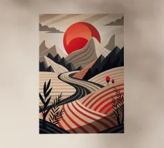 Un dipinto paesaggistico vibrante e minimalista che raffigura una strada tortuosa che conduce verso una maestosa catena montuosa immersa nel caldo bagliore del sole al tramonto.