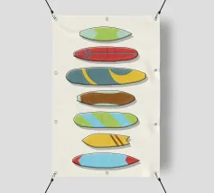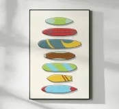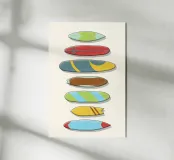 Questo poster pulito e minimalista mostra una fila verticale di tavole da surf stilizzate, ognuna con una propria tavolozza di colori e un motivo grafico distintivo. Le texture morbide e i toni tenui conferiscono all'opera d'arte un'atmosfera rilassata e retrò, pur mantenendola moderna e incentrata sul design. Ogni tavola sembra unica, ma insieme formano una composizione equilibrata e armoniosa. Surf Quiver è perfetto per i surfisti, gli amanti dell'oceano o chiunque apprezzi l'estetica rilassata della costa. Aggiunge un'atmosfera sportiva e informale a qualsiasi stanza senza essere invadente o distrarre.