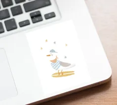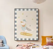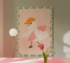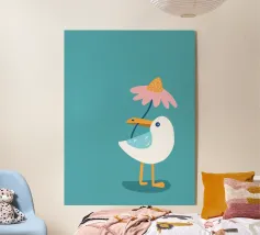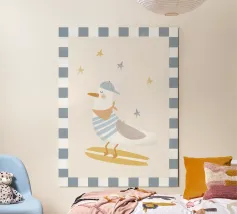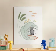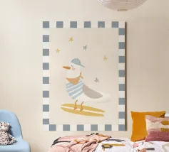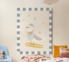 Una graziosa illustrazione di un gabbiano che fa surf, con un adorabile uccellino che cavalca un'onda indossando un cappello giallo brillante. Questa giocosa opera d'arte costiera è perfetta per decorare le pareti della cameretta dei bambini, le camere da letto a tema spiaggia e le sale giochi ispirate all'oceano. I colori allegri e la divertente atmosfera marittima la rendono un'aggiunta incantevole alle camerette dei neonati e agli spazi per bambini con un tema nautico o estivo. Un'opera dolce per i piccoli amanti dell'oceano e per gli arredi ispirati al surf.