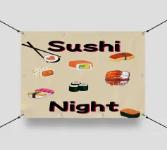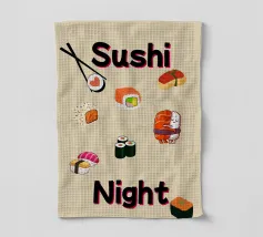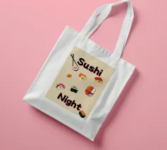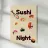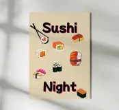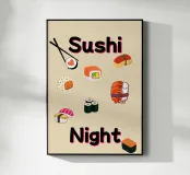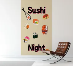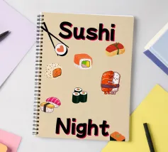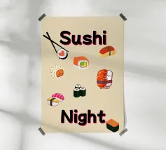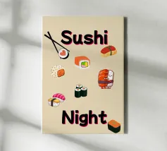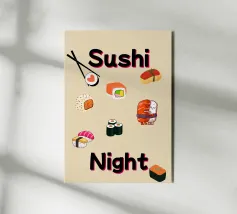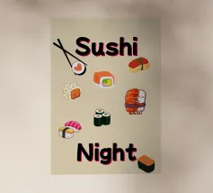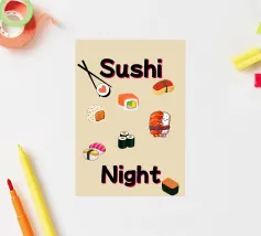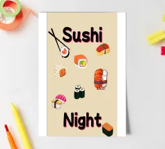 Adorabili personaggi del sushi sono disposti intorno al testo "Sushi Night" in disegni giocosi e colorati. Vari tipi di sushi, tra cui nigiri, maki e temaki, sono rappresentati in modo creativo con espressioni simpatiche e stravaganti.
