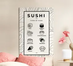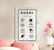Design con diversi tipi di variazioni di sushi. Variazioni di sushi giapponese come nigiri, maki, temaki ecc. in bianco e nero.