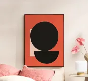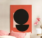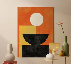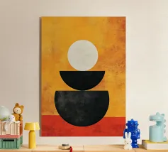 A bold abstract composition built from simple geometric forms and strong contrast. Deep black shapes float against a warm coral background, creating a sense of balance, tension, and quiet focus. The minimal palette and textured surfaces give this artwork a sculptural presence, inviting contemplation through simplicity.