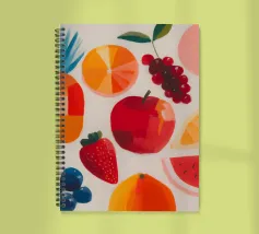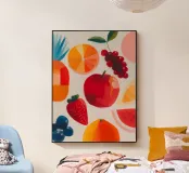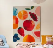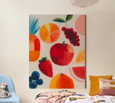 Una composizione audace e giocosa di frutti in uno stile moderno e grafico. Le forme pulite e i colori vivaci rendono quest'opera d'arte perfetta per gli interni contemporanei in cerca di un accento allegro.