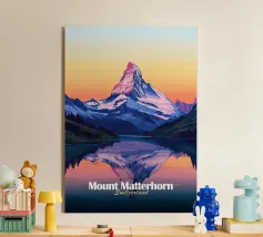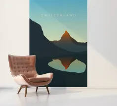 Design minimalista della Svizzera Lago di montagna di fronte al Cervino nelle Alpi svizzere. Design minimalista del tipico paesaggio montano al tramonto in Svizzera.
