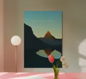 Minimalistisches Schweiz Design Bergsee vor dem Matterhorn in den Schweizer Alpen. Minimalistisches Design der typischen Berglandschaft bei Sonnenuntergang in der Schweiz.