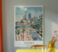 Design di viaggio minimalista con i punti di riferimento della città australiana di Sydney. Collage decorativo di edifici famosi come la Sydney Opera House, il Sydney Harbour Bridge e la Sydney Tower Eye.