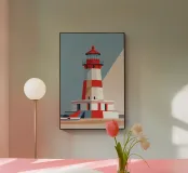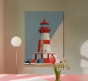 Questa opera d'arte modernista presenta il faro di Hörnum come una struttura audace e dinamica, che enfatizza gli angoli acuti e le forme astratte. In equilibrio tra realismo e astrazione, il faro è semplificato in suggestive bande rosse e bianche, sullo sfondo di un cielo blu intenso e di una sabbia strutturata. Il gioco di campi di colore e ombre della composizione crea un senso di profondità, rendendolo un tributo contemporaneo al patrimonio marittimo e alla bellezza costiera di Sylt.