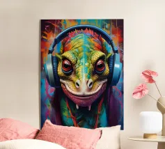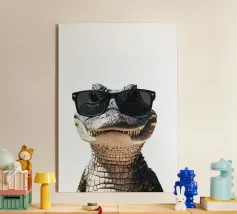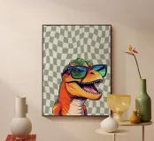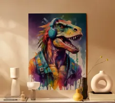 Questo vibrante T-Rex sfoggia un paio di eleganti occhiali da sole, che fondono la forza preistorica con la modernità. Un pezzo audace e divertente per gli amanti dei dinosauri e dell'arte tagliente.