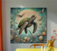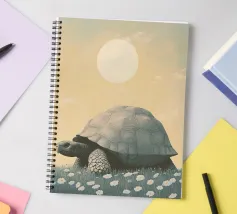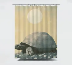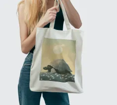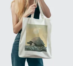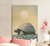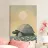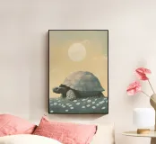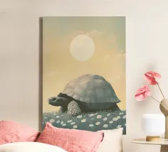Una grande tartaruga, un'illustrazione semplice ed elegante della massiccia creatura che cammina tra l'erba e i fiori bianchi sotto un cielo color pastello con il sole sullo sfondo. L'opera d'arte è presentata in uno stile estetico vintage con colori tenui e luci soffuse che creano un'atmosfera tranquilla.