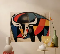 Una rappresentazione astratta e imponente della testa di un toro, costruita con piani sovrapposti, texture consumate e un'intensa profondità tonale. Sullo sfondo di un potente campo rosso, la forma appare monumentale e simbolica, evocando forza, determinazione e presenza grezza. Le superfici frammentate e i dettagli simili a collage aggiungono complessità, conferendo all'opera un senso di storia e peso sotto il suo aspetto audace.