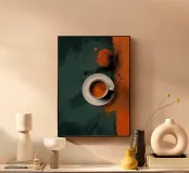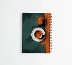 caffè tazza piattino espresso schizzo arancione verde contrasto bevanda bevanda caffeina ceramica liquido struttura astratto design artistico vibrante cerchio centrato