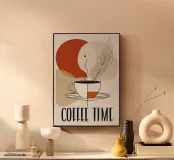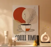 caffè tazza piuma piattino vapore linea-arte moderno minimalista beige arancione crema tipografia testo illustrazione design grafico astratto cerchio forma titolo di giornale bevanda