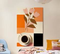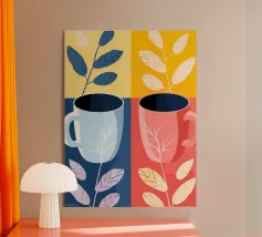 tazza da caffè piattino pianta in vaso foglie sole cerchio rettangolo ramo tavolo vaso per piante ombre forme geometriche arredamento minimalista design d'interni arte moderna tazza linea dell'orizzonte elementi astratti contrasto di colori tema del minimalismo