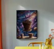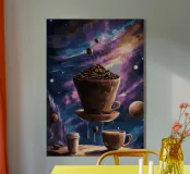 caffè tazza di caffè chicchi di caffè galassia cosmico stelle pianeti oggetti galleggianti disco volante spazio esterno cielo notturno tema celeste bevanda calda vapore sfidare la gravità cosmo cielo universo macinare fermentare