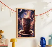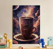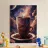 caffè tazza di caffè vapore spazio luna pianeti chicchi di caffè piattino nuvole cielo notturno celeste cosmo galassia stelle tramonto colori caldi spazio esterno aroma mattina bevanda