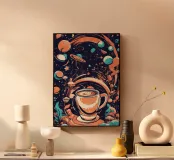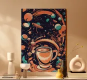 tazza di caffè pianeti saturno stelle nuvole vorticose funghi galassia spazio esterno foglie asteroidi pianeta inanellato cielo notturno caffè fantasia paesaggio surreale scena cosmica oggetti galleggianti elementi della natura corpi celesti design stravagante