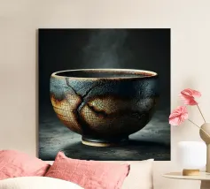 tazza da tè piattino incenso fumo verde forma curva motivo geometrico minimalista rosso tazza in ceramica design d'interni calma eleganza serenità ora del tè contrasto linee fluide zen tranquillità aroma