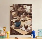 coffee mugs office desk computer screen notebook pencil holder office chair window papers keyboard spoon coffee cups stationery notes table digital art board sketch pad office space wooden desk pen