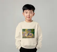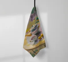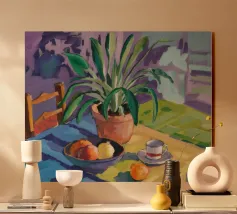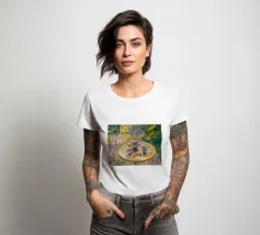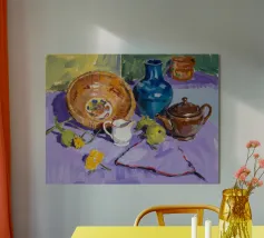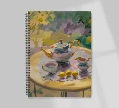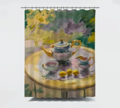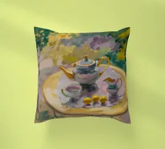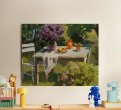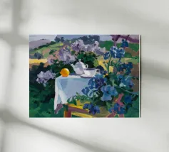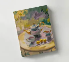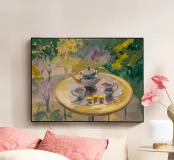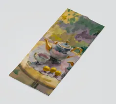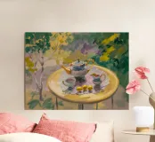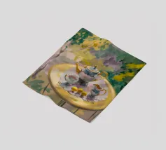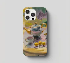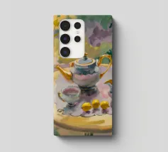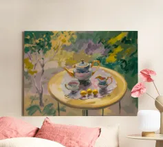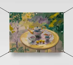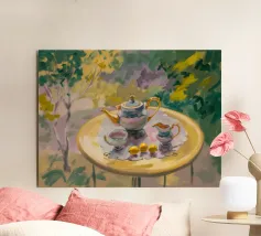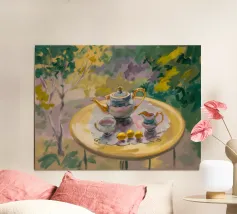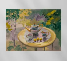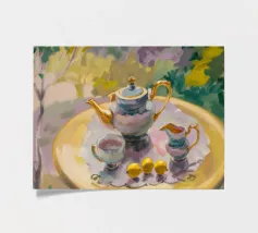 A still life painting shows a porcelain teapot and cups with gold accents on a patterned tray, placed on a light-colored slatted table, suggesting an elegant outdoor tea setting with soft, warm light.