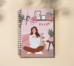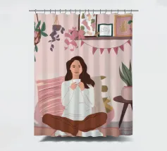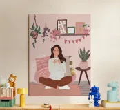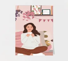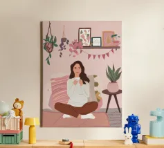 Una donna siede su un accogliente letto rosa con una tazza di tè, circondata da piante sospese, creando un momento di calma per la cura di sé.