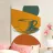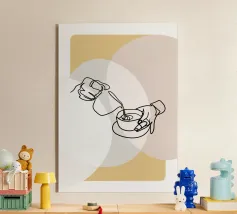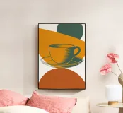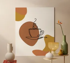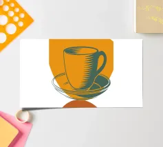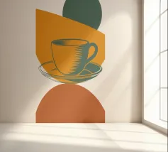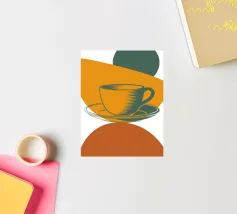Un'audace rappresentazione stilizzata di una tazza da tè si trova in cima a un piattino, circondata da forme geometriche sovrapposte nei toni della terra. Il disegno utilizza una tavolozza di colori limitata di arancione, verde e marrone per creare una composizione moderna e astratta.