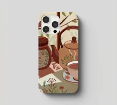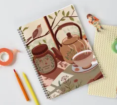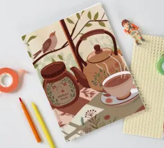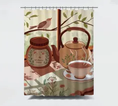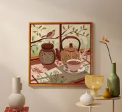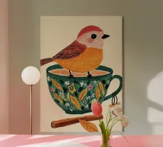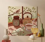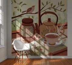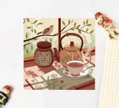 This painting features a beautifully set tea table by a window, with a teapot, a steaming cup of tea, and a jar. Birds are perched on branches outside the window, adding nature's charm to the tranquil indoor setting.