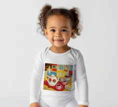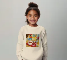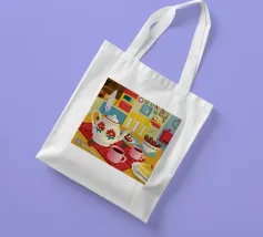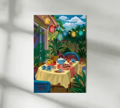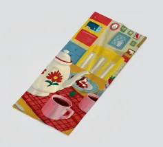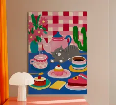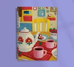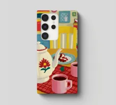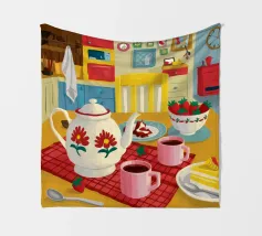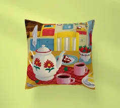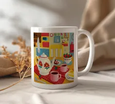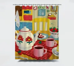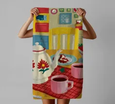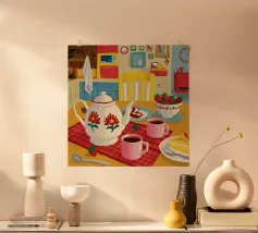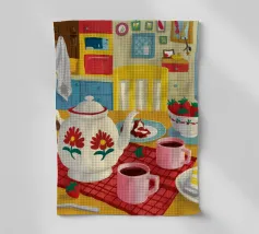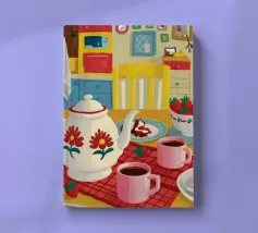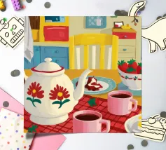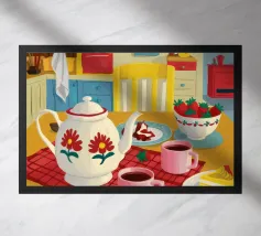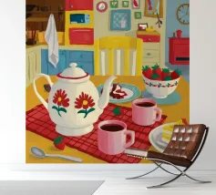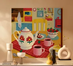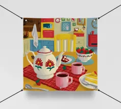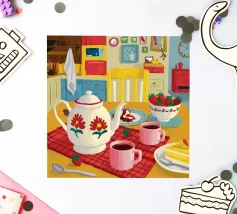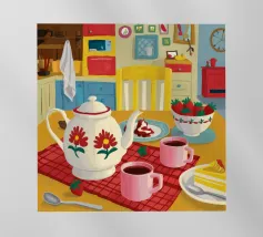 Un accogliente tavolo da cucina, apparecchiato con teiere di ciliegio e dolciumi, risplende nei caldi colori giallo e rosso.