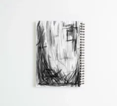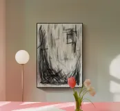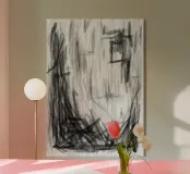 Dalla serie Explorations in Charcoal (Esplorazioni a carboncino), Frame utilizza segni pesanti con molto movimento ed energia su strati in scala di grigio e segni di firma.