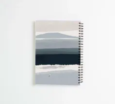 Morbide tonalità di blu e grigio creano un paesaggio sereno, raffigurante una montagna, le onde dell'oceano e un uccello sulla riva. La composizione minimalista enfatizza la calma e la tranquillità.