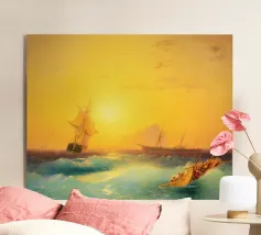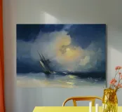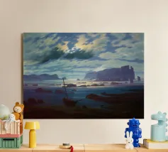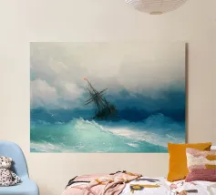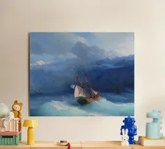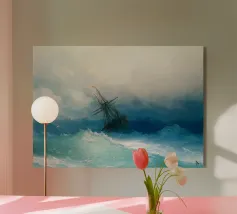 Tempesta in mare in una notte di luna - Ivan Aivazovsky Questo suggestivo paesaggio marino di Ivan Aivazovsky raffigura un'imbarcazione che affronta onde turbolente al chiaro di luna. Il contrasto tra la luce argentea e l'acqua scura e agitata accresce il dramma e conferisce alla scena un'atmosfera poetica e ammaliante. La maestria di Aivazovsky nel gestire la luce e il movimento conferisce tensione e bellezza al mare notturno. La sua presenza lunatica e cinematografica lo rende particolarmente adatto a salotti, studi, biblioteche e interni raffinati che privilegiano un'arte drammatica e d'atmosfera.