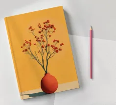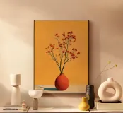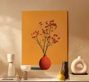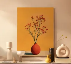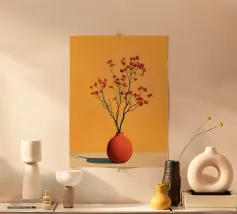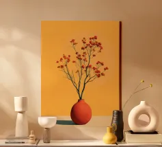Una natura morta minimalista con un vaso scultoreo in terracotta e delicati rami coronati da vivaci fiori rossi. Su uno sfondo dorato e caldo, la composizione bilancia i toni terrosi con accenti di colore audaci, creando un effetto visivo raffinato ma di grande impatto. Il contrasto tra la superficie ruvida dell'argilla e la silhouette floreale ariosa conferisce profondità e sobria eleganza all'opera. Perfetta per interni moderni, spazi scandinavi o case contemporanee accoglienti che abbracciano materiali naturali e colori decisi.