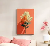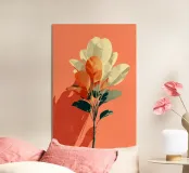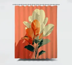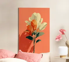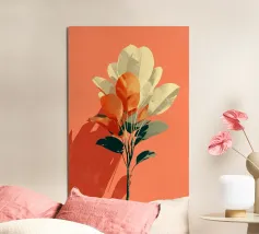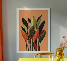 Un'opera d'arte botanica minimalista che mescola i toni tenui del crema e quelli vibranti della terracotta. La composizione presenta foglie stilizzate disposte in una forma dinamica ma rilassante, che proiettano ombre audaci su uno sfondo caldo. Ideale per aggiungere un tocco moderno e terroso a qualsiasi spazio interno.
