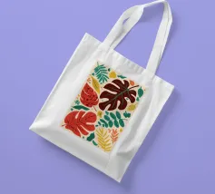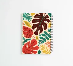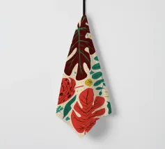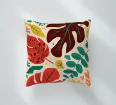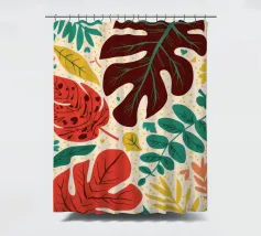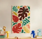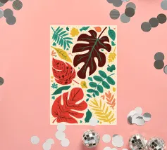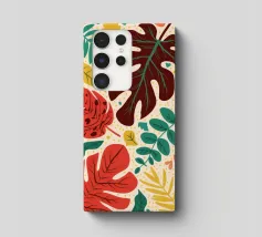 Un motivo di monstera stilizzata e altre foglie tropicali in tonalità terracotta, giallo senape e verde su uno sfondo chiaro, che crea un disegno botanico caldo, moderno e armonioso.