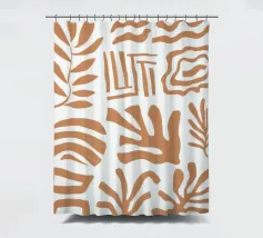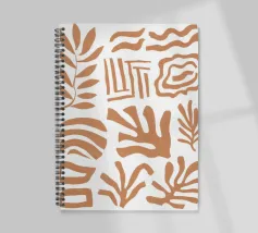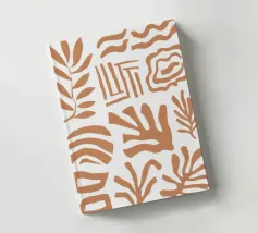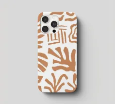 Una giocosa composizione astratta di varie forme organiche in terracotta, bianco e blu, che danzano su uno sfondo neutro in uno stile che ricorda Maraoui.
