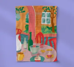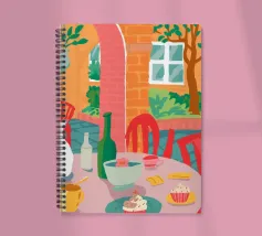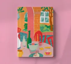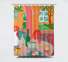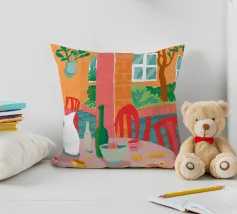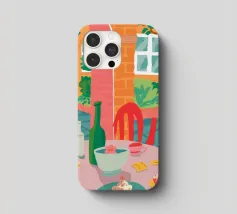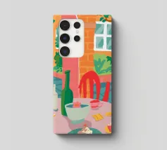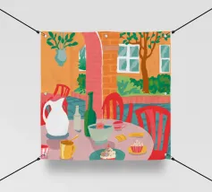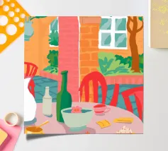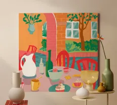 Una vivace scena di ristorazione all'aperto presenta un tavolo rosso carico di brocca, bicchieri e cibo, circondato da piante e facciate di edifici colorati, evocando un pasto mediterraneo allegro e vivace.