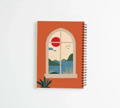 Un'immagine semplice ma profonda mostra la vista del mare e del sole al tramonto attraverso una finestra ad arco in una parete color terracotta, evocando un senso di pace, solitudine e calore.