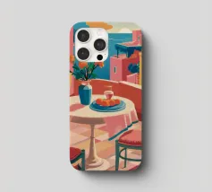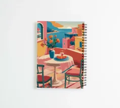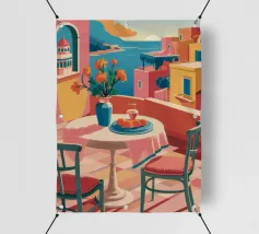 Un'incantevole terrazza con vista su una città costiera mediterranea baciata dal sole e sul mare, con tavoli apparecchiati per un pasto, che evoca un'esperienza gastronomica rilassante e pittoresca.