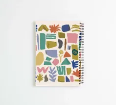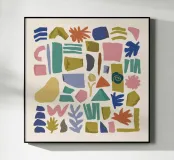 Un motivo giocoso di forme astratte e sparse in una tavolozza di colori pastello che ricorda un moderno pavimento a terrazzo.