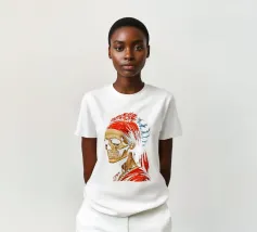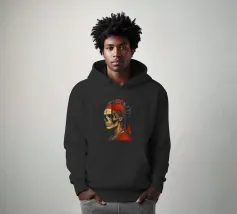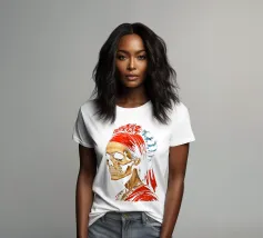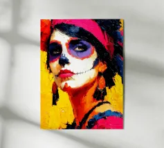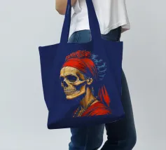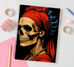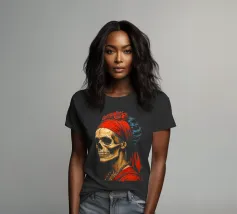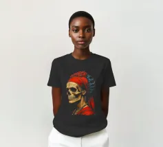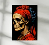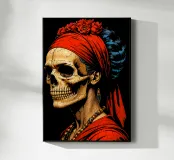 Ein markantes Bild, das die ikonische Künstlerin Frida Kahlo auf ungewöhnliche Weise darstellt: Ihr Gesicht ist zu einem stilisierten Piratenschädel geworden, umrahmt von einem leuchtend roten Bandana. Das Bandana, ein Symbol für Rebellion und Freiheit, verwebt sich mit Fridas bekannter Vorliebe für farbenfrohe Kopfbedeckungen und ihren kämpferischen Geist.