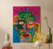 A portrait featuring a head with a green crown, surrounded by swirling abstract designs. The textured elements and bold lines create a visually arresting image.