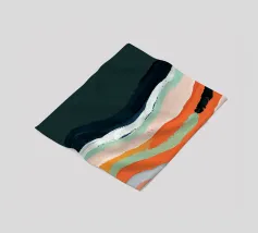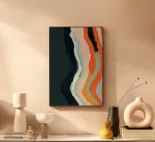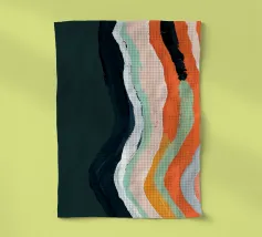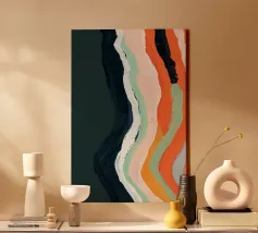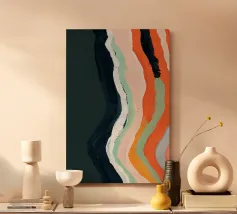 Questa composizione astratta esplora il ritmo, la consistenza e il movimento attraverso strisce pittoriche stratificate. Le forme verticali fluide in verde intenso, fard tenue, menta e arancione caldo creano una superficie tattile, quasi tessile. La pennellata visibile e i bordi organici evocano le pieghe dei tessuti, il movimento e l'armonia visiva. Minimale ma espressiva, quest'opera d'arte bilancia il contrasto audace con la morbidezza, rendendola ideale per interni contemporanei, arte da parete moderna o stampe d'arte su larga scala incentrate su colore, texture e design.