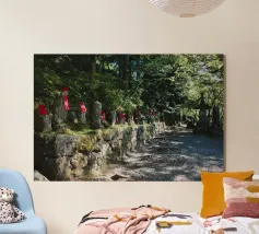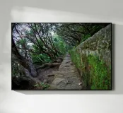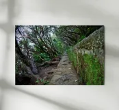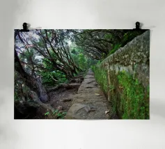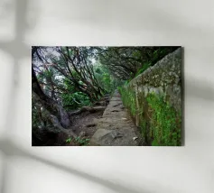Seguite le antiche pietre in un mondo incantato. Questa fotografia, lunatica e suggestiva, invita a percorrere un sentiero dimenticato, fiancheggiato da un muro ricoperto di muschio e da una chioma di alberi nodosi. È un viaggio nel cuore di una foresta misteriosa e magica, dove ogni svolta racchiude un segreto. Un'opera accattivante e coinvolgente che parla all'avventuriero e al sognatore che c'è in ognuno di noi e che porta lo spirito senza tempo e sussurrante dei boschi profondi direttamente sulle vostre pareti.
