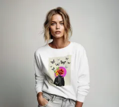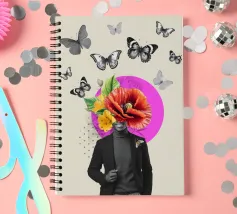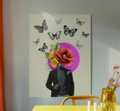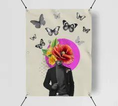 Audace, vibrante e piena di energia surreale, questa stampa artistica a collage fonde moda, natura e immaginazione in una storia visiva di grande impatto. Un uomo alla moda in toni monocromatici sorride fiducioso mentre la sua testa sboccia in un vivido bouquet di papaveri rossi e fiori gialli, circondato da svolazzanti farfalle in bianco e nero e da un'ape ronzante. Su un morbido sfondo beige con un audace cerchio magenta, quest'opera d'arte irradia gioia, creatività ed eleganza moderna. Ideale per interni contemporanei, spazi alla moda o come pezzo forte in studi creativi e uffici.