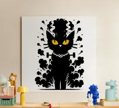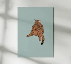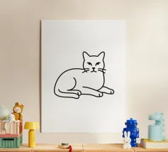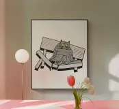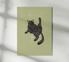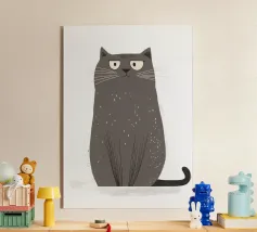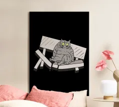 Un disegno divertente mostra un gatto grigio seduto su una panchina rotta nel parco. L'illustrazione ricrea la scena con un tocco comico, esagerando l'espressione del gatto. È come se il peso del gatto avesse causato l'incidente, creando una scena divertente e ironica.